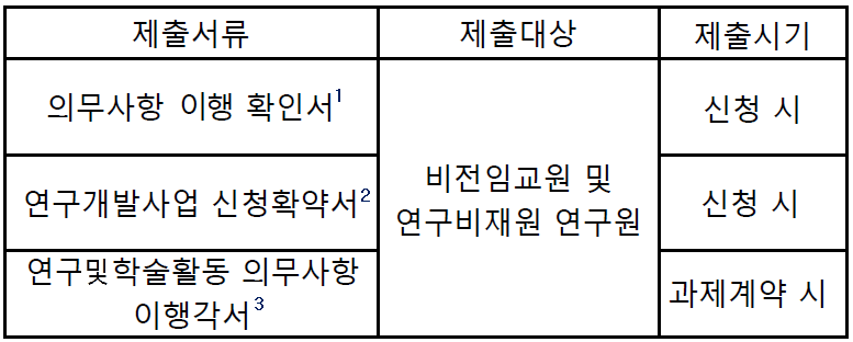 비전임교원 및 연구비재원 연구원이 신규 과제 신청 시 「의무사항 이행 확인서」(붙임1) 와 「연구개발사업 신청확약서」(붙임2) 필수 제출해야하며,